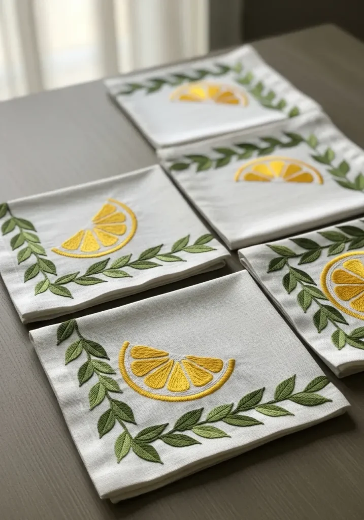 These crisp white napkins are embroidered with bright yellow lemon slices and soft green leafy branches. The stitching is clean and neat, with satin stitches filling the lemon wedges and fine lines outlining each detail. The white fabric makes the citrus colors pop beautifully, giving the whole set a fresh and summery feel. The repeated pattern across multiple napkins makes it look polished and perfect for a cheerful table setting.