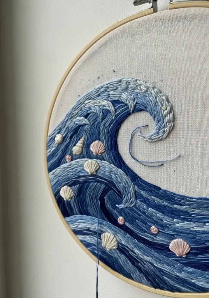 This embroidery hoop features a dramatic blue ocean wave stitched onto neutral fabric. Layers of deep navy, soft sky blue, and white thread create movement and depth in the curling water. The stitches are slightly raised and varied, giving the wave a textured look that feels almost sculptural. Tiny stitched shells and foam details add charm and dimension without overwhelming the design.