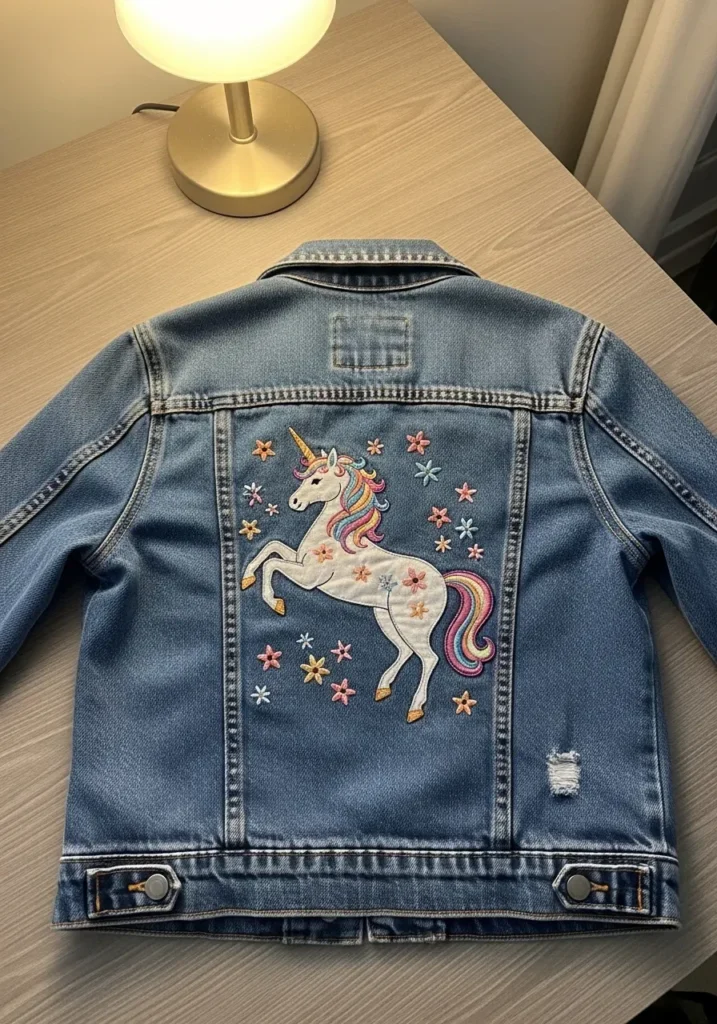 This light blue denim jacket features a whimsical embroidered unicorn across the back, surrounded by tiny stars. The unicorn is stitched in soft pastel shades with a flowing mane and delicate details. The contrast between the structured denim and the colorful thread makes the design stand out beautifully. The embroidery transforms a basic jacket into something playful and unique.