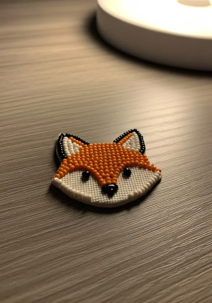 This small bead embroidery pattern features a sweet little fox face stitched in warm orange, creamy white, and glossy black seed beads. The rounded cheeks and pointed ears are outlined with tiny dark beads, which help define the shape and make the design pop against the fabric. Smooth rows of orange beads fill the top of the head, while soft white beads create the muzzle area for a cute contrast. Shiny black beads form the eyes and nose, giving the fox an expressive and playful look.
