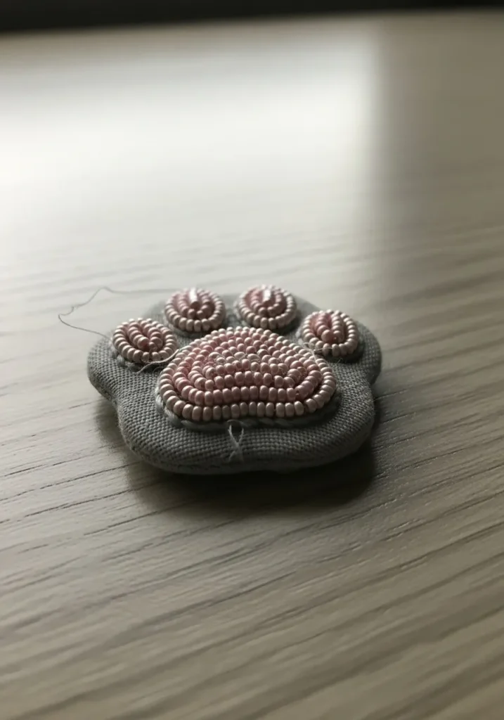 This small bead embroidery pattern features a sweet paw print stitched in soft blush pink seed beads on a simple fabric base. The central pad is built with rounded rows of beads that create a slightly raised cushion effect, while the four tiny toe pads sit neatly above it in matching tones. The beads are arranged in tight spirals, giving the design a lovely textured finish that feels both cozy and polished. The neutral background keeps all the focus on the delicate pink details.