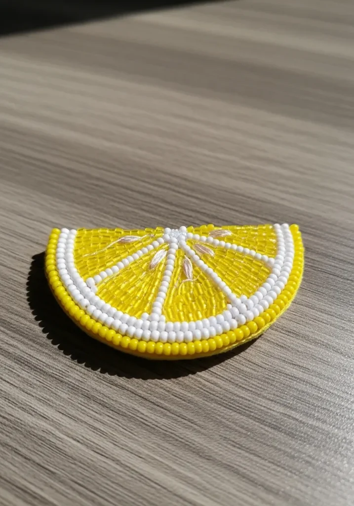 This cheerful little bead embroidery design looks just like a fresh lemon slice ready for summer. Tiny yellow seed beads fill each segment, arranged in neat rows that radiate from the center like real citrus pulp. Crisp white beads outline every wedge and create that juicy inner rind, while a bold ring of sunny yellow beads frames the outer edge. A few translucent beads near the center add a glossy touch that makes the whole piece feel bright and zesty.