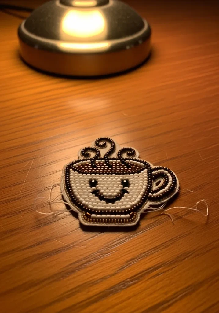 This tiny bead embroidery design features the sweetest little coffee cup with a happy face and swirly steam rising from the top. The cup is filled with creamy white seed beads, outlined in rich brown and black for definition. The coffee surface is stitched in warm chocolate tones, while the steam curls are carefully shaped with darker beads to give them that cozy look. A neat border frames the whole piece so it feels finished and sturdy, perfect as a patch or brooch.