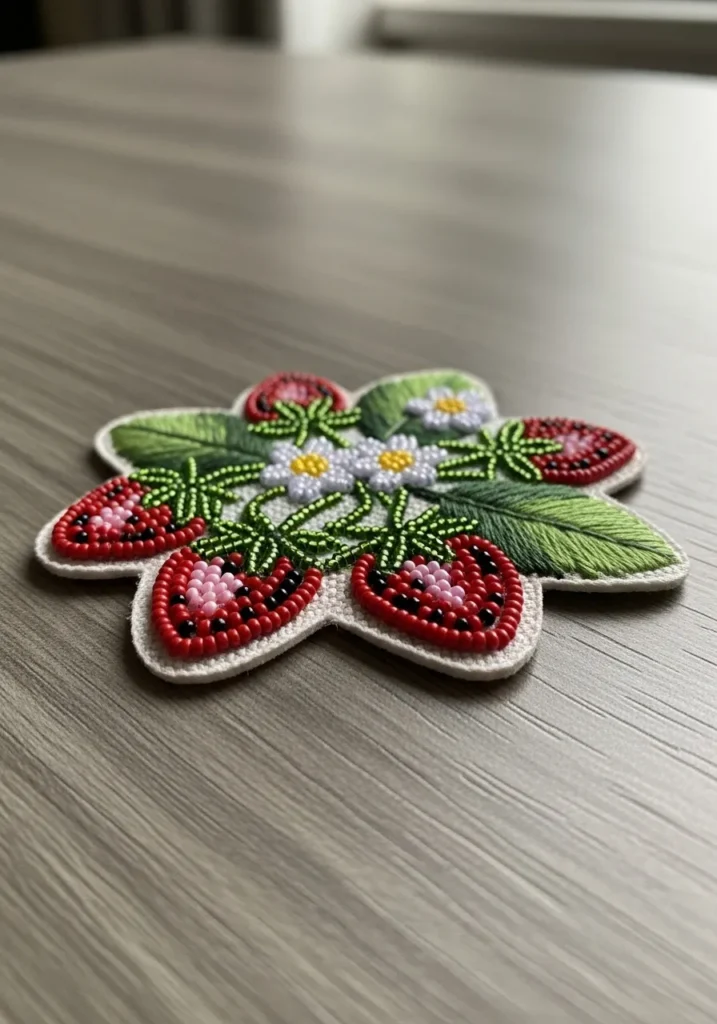 This lovely small bead embroidery pattern brings together juicy red strawberries, tiny white blossoms, and soft green leaves in one charming little design. The strawberries are stitched with glossy red and pink seed beads, dotted with tiny black beads for seeds, while the leaves show delicate thread shading that adds texture and depth. Petite white and yellow bead flowers sit at the center, all neatly arranged on a soft fabric base with a clean embroidered edge that frames the whole piece beautifully.