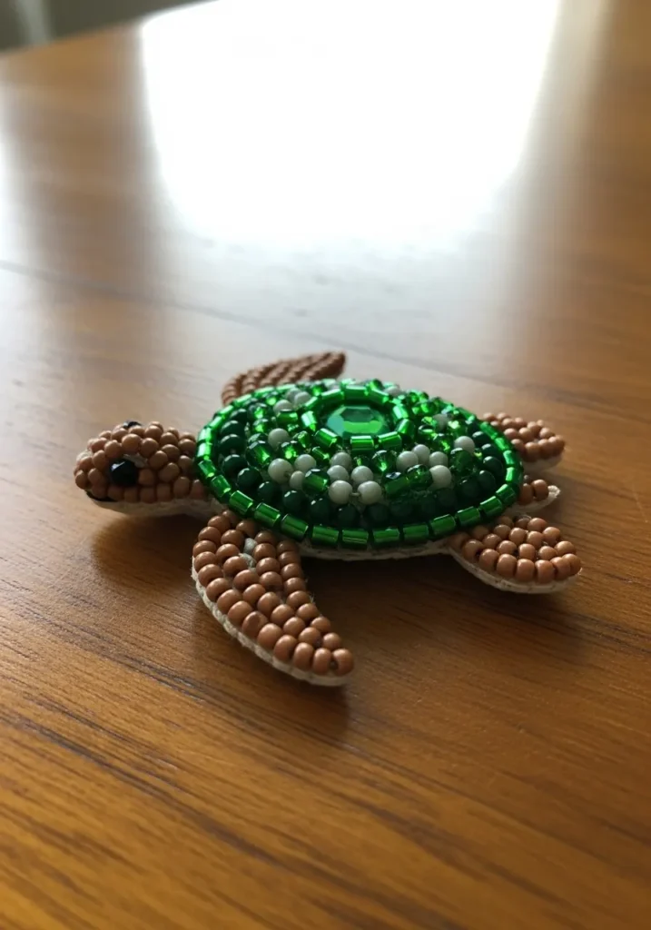 This tiny bead embroidery turtle is such a gem. The shell is layered with rich green seed beads and shiny bugle beads, arranged in neat circles around a faceted emerald centerpiece that really catches the light. Small white beads add contrast across the shell, giving it extra detail and texture. The head and flippers are stitched with warm brown beads, each one placed carefully to create smooth curves and a sweet little face. The mix of glossy, matte, and faceted beads makes the whole design feel dimensional and lively.
