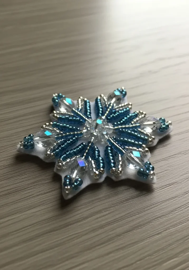 This sparkling snowflake design is such a stunner in miniature form. It is built on soft white felt and layered with icy blue seed beads, metallic silver bugle beads, and clear faceted crystals that catch the light from every angle. The center features a cluster of transparent beads that radiate outward into pointed arms, each one carefully stitched to create symmetry and dimension. Tiny bead clusters at the tips add extra detail, making the whole piece look crisp and frosty.