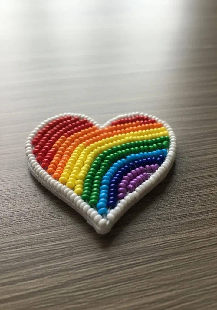 This cheerful small bead embroidery pattern features a plump heart filled with neat rainbow rows of glossy seed beads. Each curved stripe flows from red to purple in smooth, slightly arched lines that follow the shape of the heart beautifully. A clean border of white beads frames the entire design, giving it a polished and defined edge. The beadwork sits slightly raised on the fabric, creating a textured surface that catches the light and makes the colors feel even more vibrant.