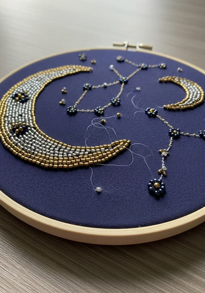 This modern beadwork embroidery hoop features a stunning crescent moon stitched in layered rows of metallic gold and silver beads against deep indigo fabric. The moon has a subtle curve that feels soft yet bold, with tiny floral bead clusters adding extra sparkle. Scattered bead stars and a delicate constellation pattern connect across the hoop in navy and gold tones, giving the whole piece a dreamy night sky vibe. The mix of matte and glossy beads creates beautiful texture, and the wooden hoop frames it like a piece of wall art you would happily display year round.