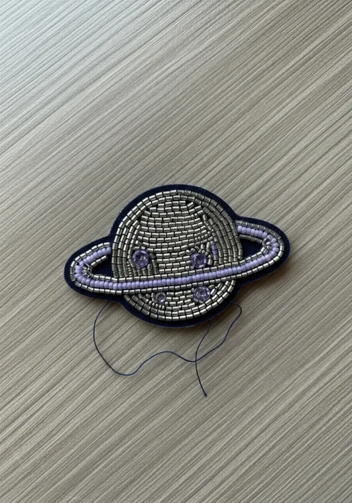 This modern beadwork embroidery patch features a stylized Saturn design stitched on a dark fabric base. The planet itself is filled with rows of metallic silver tube beads that create a sleek, futuristic texture. Soft lavender seed beads form the ring, wrapping smoothly around the planet and adding a gentle pop of color. Tiny purple gem accents are scattered across the surface like glowing craters, giving the whole piece a subtle celestial sparkle. The dark outline keeps everything crisp and graphic, making the shape stand out beautifully.