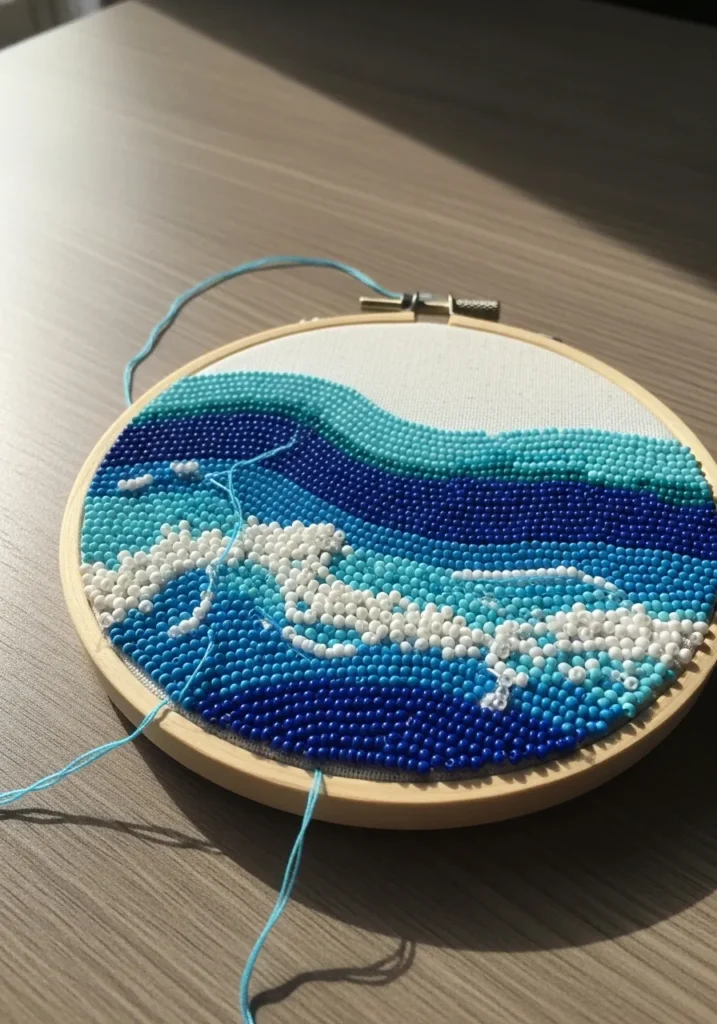 This modern beadwork embroidery hoop captures rolling ocean waves in stunning shades of deep navy, cobalt, aqua, and soft seafoam. Tiny seed beads are stitched in flowing horizontal rows that curve gently across the hoop, creating a sense of movement and depth. Crisp white beads form the foamy crests, adding texture and contrast against the layered blues. The wooden hoop frames the design like a mini seascape, and the dense beadwork gives the surface a beautifully raised, almost tactile quality.
