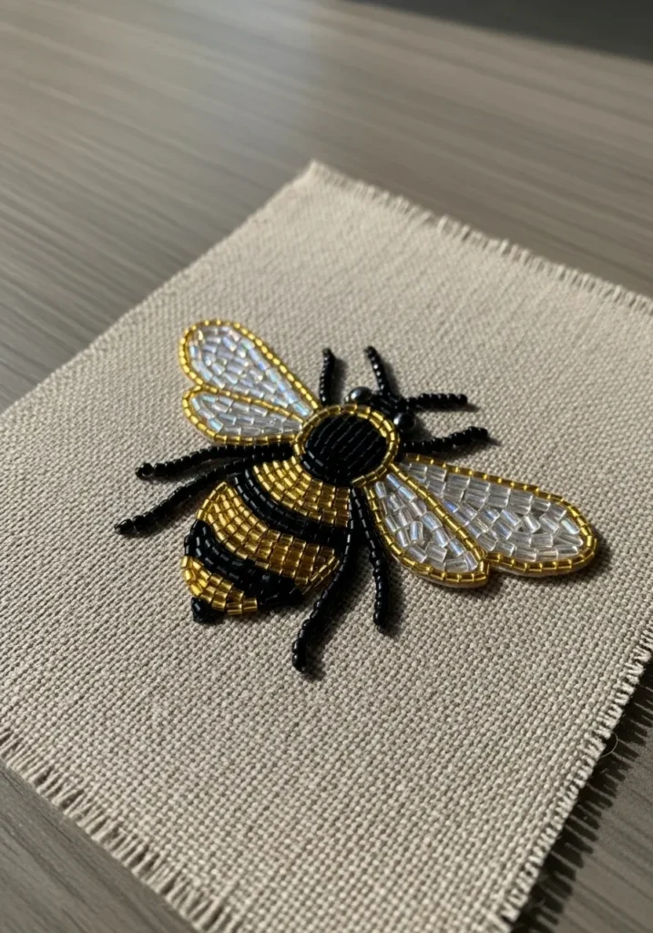 I love how powerful such a small creature can look in beadwork form. If you enjoy nature inspired designs with a bit of edge, this bee is such a fun project to try. The striped body is simple to build row by row, and adding the shimmering wings at the end feels like the perfect finishing touch. It would look amazing on a jacket, tote, or even framed in a hoop for a modern farmhouse vibe with a little sparkle.