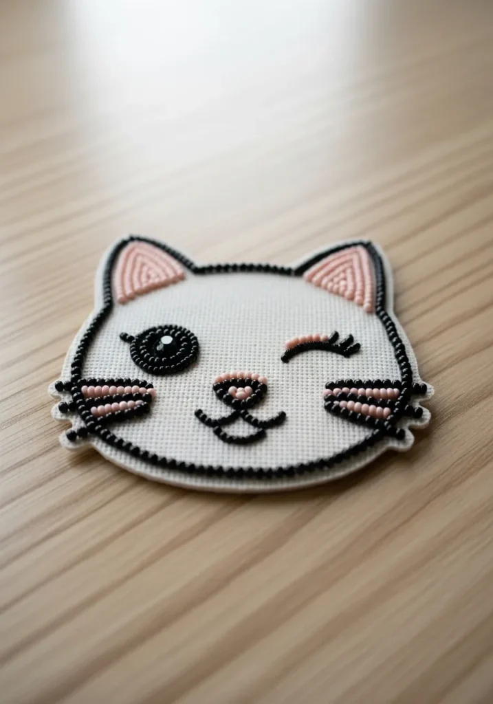 This adorable modern beadwork embroidery patch features a sweet little cat face stitched onto cream fabric and edged with tiny black beads for a crisp outline. One eye is open with a glossy black beaded circle and a tiny highlight, while the other eye is playfully winking in curved black beads. Soft blush pink beads fill the ears, cheeks, and nose, adding a gentle pop of color against the neutral background. The whiskers and smile are carefully outlined in black beads, giving the whole design a clean graphic look with just enough texture to make it feel handmade and charming.