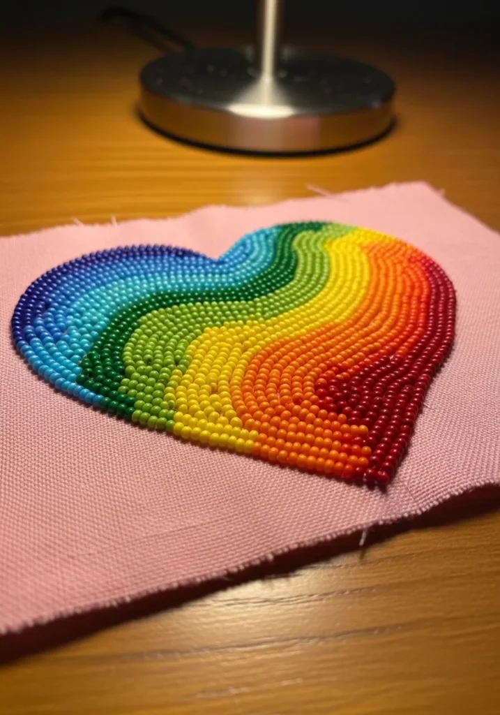 This modern beadwork embroidery features a bold heart shape stitched onto soft pink fabric, completely filled with tiny round seed beads arranged in flowing rainbow waves. Shades of deep blue blend into teal, green, yellow, orange, and rich red, creating a smooth gradient that almost looks like it’s moving. The beads are placed tightly together, giving the surface a raised, glossy texture that catches the light beautifully. The contrast between the bright, glassy beads and the matte fabric makes the heart pop in the most satisfying way.