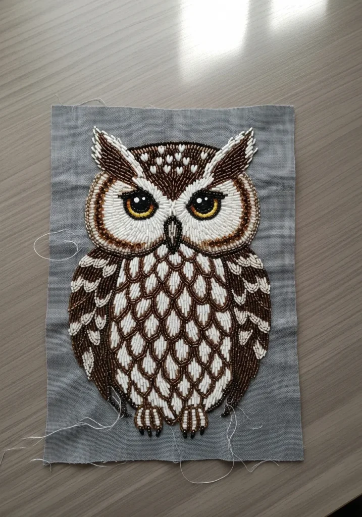 This charming owl design is stitched onto a soft gray fabric and completely brought to life with layered seed beads and bugle beads in warm brown and creamy white tones. The body features neat rows of elongated beads that mimic feathers, outlined with tiny round beads for extra definition. Its wide eyes glow with golden yellow and black beads that instantly grab your attention. The ears, wings, and tiny talons are carefully shaped with contrasting bead sizes, creating a rich, textured surface that feels detailed and dimensional.