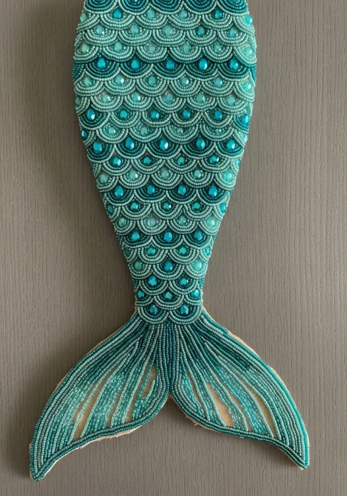 This stunning mermaid tail applique is completely covered in shimmering turquoise and seafoam green beads arranged in neat scalloped rows that mimic fish scales. Tiny seed beads form delicate arches, while glossy teardrop shaped gems sit at the center of each scale, adding depth and sparkle. The tail fin flows outward with long lines of beads that create a soft, feathered effect, almost like it is swaying underwater. The layered textures and cool ocean tones give the whole piece a dreamy, mermaid inspired vibe that feels both elegant and playful.