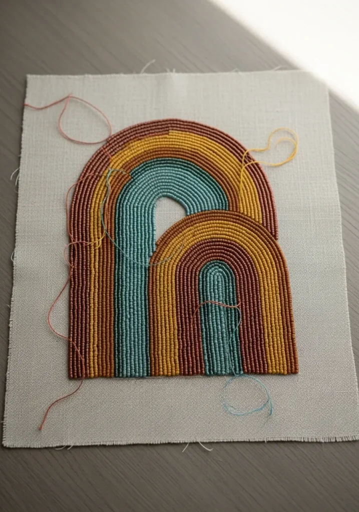This modern beadwork embroidery design features a bold rainbow arch stitched in neat rows of tiny seed beads on natural linen fabric. The color palette leans warm and earthy with mustard yellow, burnt orange, terracotta, and a soft teal center that gives it a trendy retro feel. Each curved stripe is built from tightly packed beads, creating a rich textured surface that almost looks sculpted. The layered arches overlap slightly, adding depth and a playful graphic look that feels both minimal and eye catching at the same time.