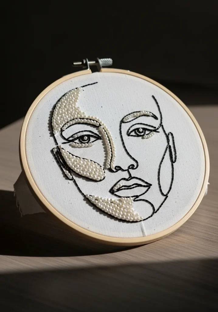 This modern beadwork embroidery hoop features a striking line art portrait stitched in sleek black thread on crisp white fabric. The facial contours are simple and fluid, creating an abstract feminine face with expressive eyes and softly shaped lips. Clusters of tiny pearl beads are carefully sewn along one side of the face, adding dimension and a luminous texture that contrasts beautifully with the clean black outlines. The wooden hoop frames the design like contemporary wall art, and the mix of smooth thread lines and raised beadwork gives it a refined yet handcrafted feel.