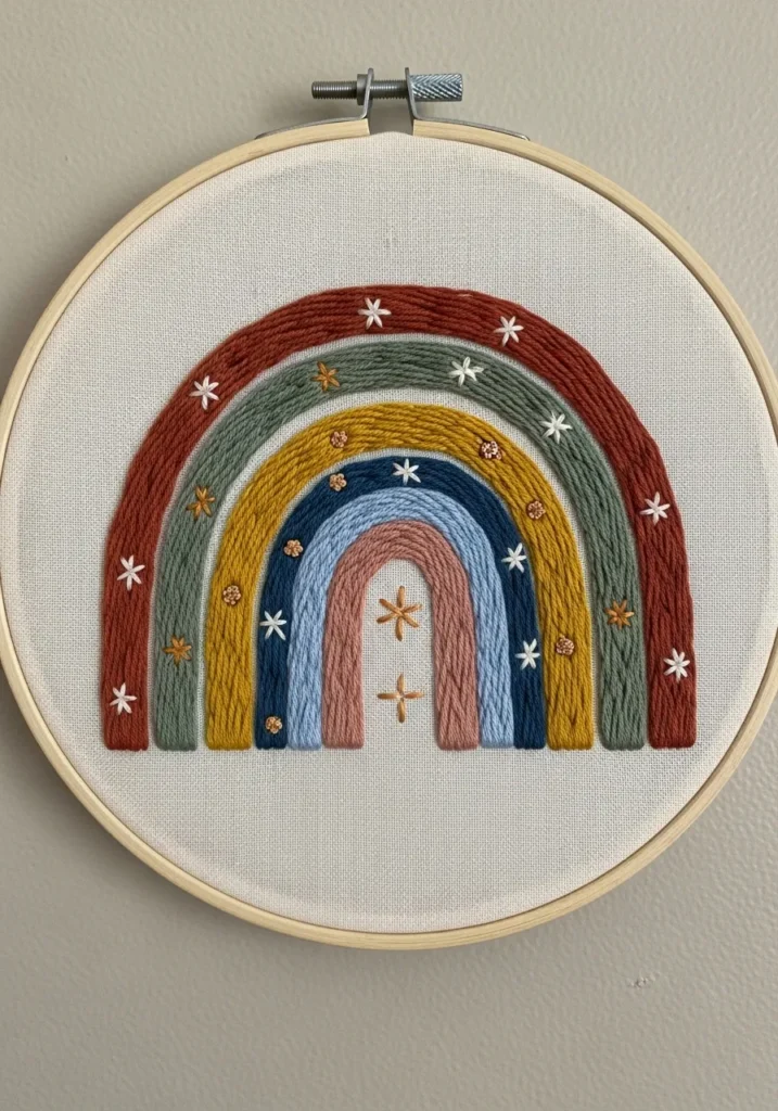 This embroidery hoop features layered rainbow arches stitched in muted earthy tones with tiny star details scattered around. The arches are filled with smooth satin stitches, giving them a soft and plush appearance. The neutral background keeps everything balanced and contemporary.