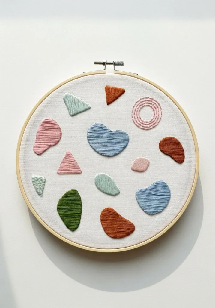 This hoop displays a collection of abstract stitched shapes in pastel and clay tones arranged in a balanced composition. Each shape has a slightly different stitch texture, adding subtle dimension without overwhelming the design. The clean white fabric background makes the colors stand out beautifully.