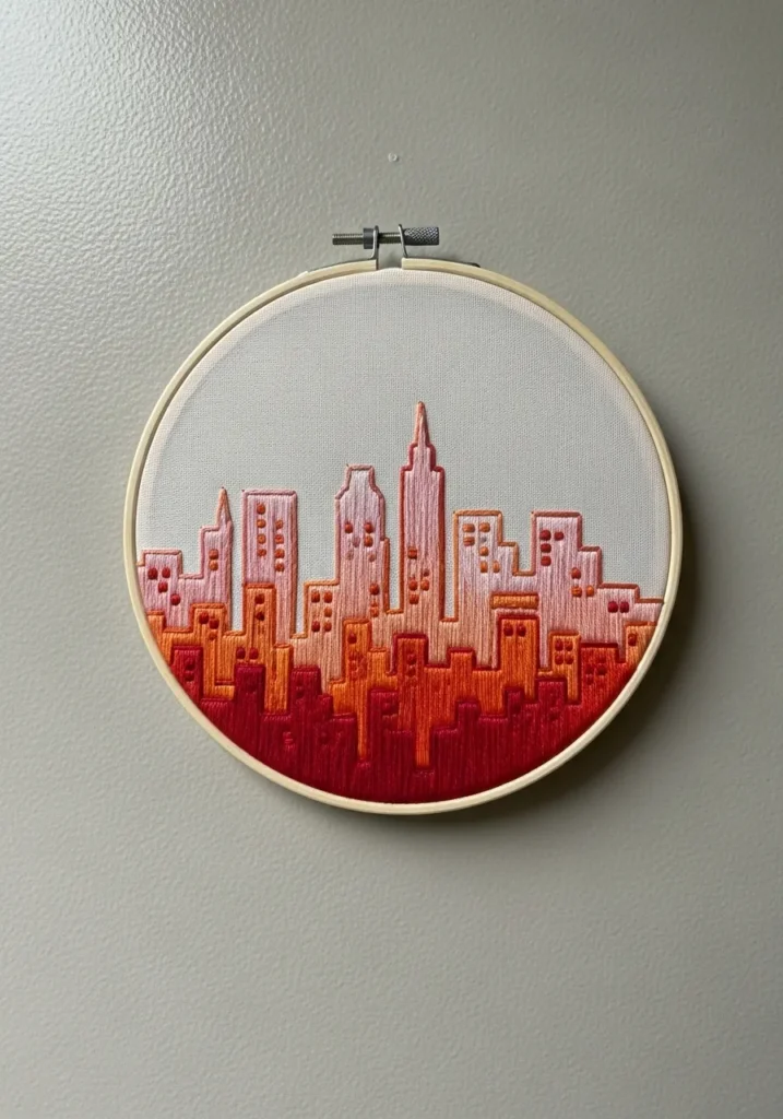 This modern embroidery hoop features a sleek city skyline stitched in layered shades of coral, blush, and deep red that fade beautifully from light to dark. The buildings are outlined with clean white thread, giving the skyline a crisp graphic look against the warm ombré background. Smooth satin stitches create a polished surface, while the simple wooden hoop keeps the overall style minimal and contemporary.