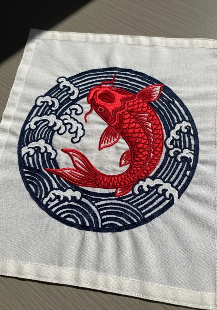 This striking embroidery piece showcases a vivid red koi fish stitched in rich satin stitches, swimming within stylized navy blue waves arranged in a circular frame. The contrast between the bright red fish and the deep blue water creates a dramatic focal point. The layered stitching adds beautiful texture and movement, making the design feel dynamic and alive.