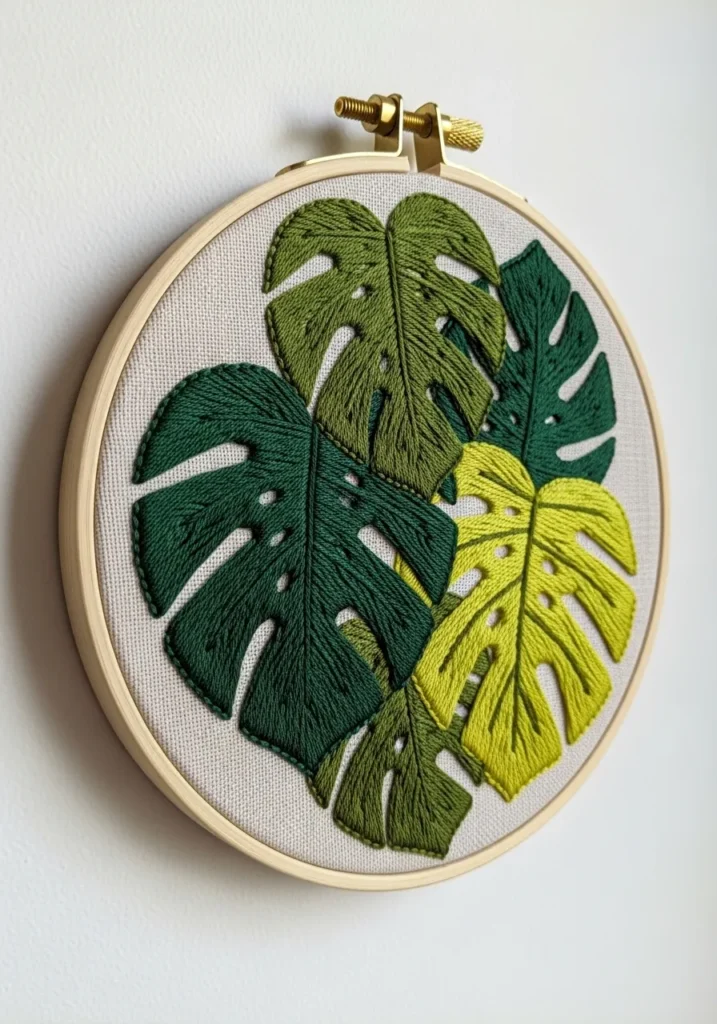 This modern hoop displays bold monstera leaves stitched in layered shades of green with clean cut out details. The leaves overlap slightly, adding depth and dimension, while the stitching direction creates subtle texture and shading. The design feels fresh and tropical but still sleek and polished.