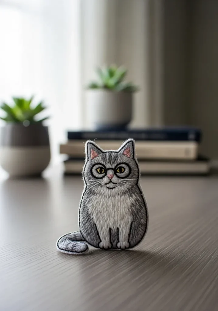 This embroidered cat design features soft gray threads layered to create gentle shading and realistic fur texture. The tiny stitched whiskers and bright eyes bring the little feline to life, while the compact shape makes it feel like a modern patch or small artwork. The clean presentation keeps it looking polished and stylish.