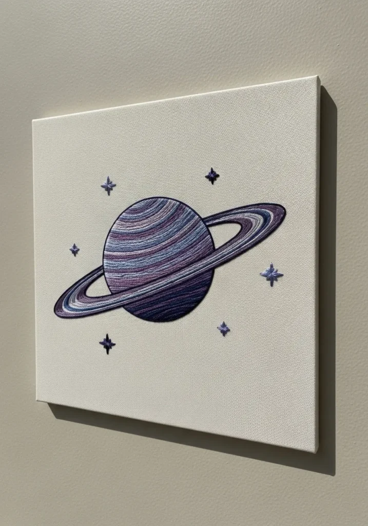This embroidery piece showcases a beautifully stitched planet with rings in soft purples and blues, accented by tiny scattered stars. The smooth satin stitches give the planet a sleek finish, while the fine line stitching around it keeps everything crisp and modern. The neutral background makes the celestial colors stand out effortlessly.
