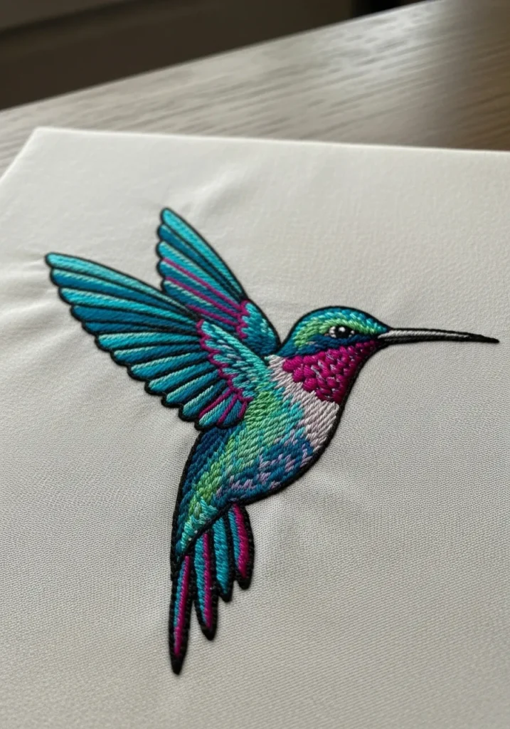 This eye catching embroidery features a hummingbird stitched in vivid teal, turquoise, and magenta threads. The wings are layered with fine directional stitches that create a sense of motion and energy. The clean outline and bold color blocking give the bird a modern, almost graphic feel.