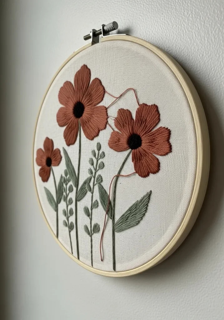 This hoop features oversized stitched flowers in warm terracotta tones with soft green stems and leaves. The petals are filled with dense satin stitches that create a slightly raised texture, while the simple background keeps the focus on the blooms. The clean composition and muted color palette give it a fresh modern feel instead of a vintage one.