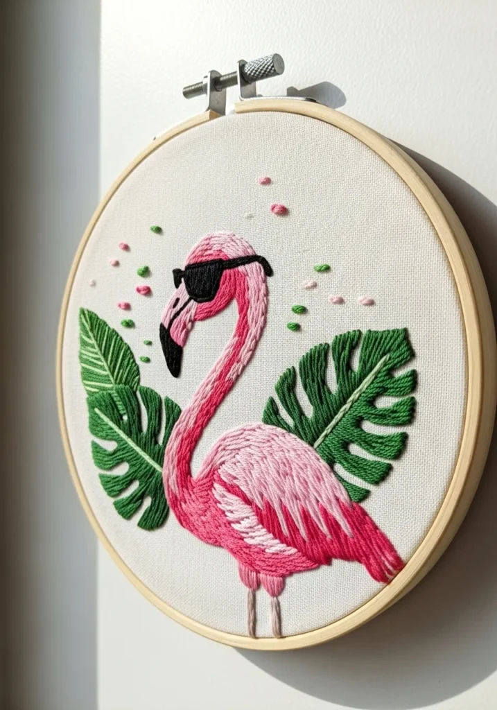 This playful embroidery design highlights a bright pink flamingo standing proudly against lush green stitched leaves. The feathers are layered with varying shades of pink thread, adding depth and a soft textured look. The tropical theme feels lively, while the neat stitching keeps everything polished and modern.