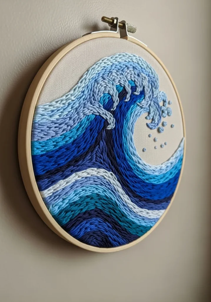 This hoop captures a dramatic ocean wave using layered blue and white threads in different shades and stitch directions. The textured stitching mimics the movement of water, giving the design a dynamic and almost three dimensional effect. The modern color palette keeps it sleek and stylish rather than overly traditional.