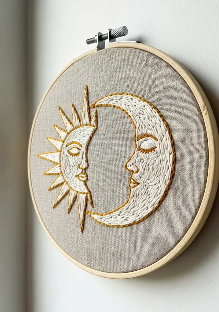 This embroidery hoop features a beautifully balanced sun and moon design stitched in warm golden thread on neutral fabric. The line work is delicate yet bold enough to stand out, and the subtle texture of the thread adds dimension to the celestial faces. The minimal color scheme keeps it sophisticated and modern.