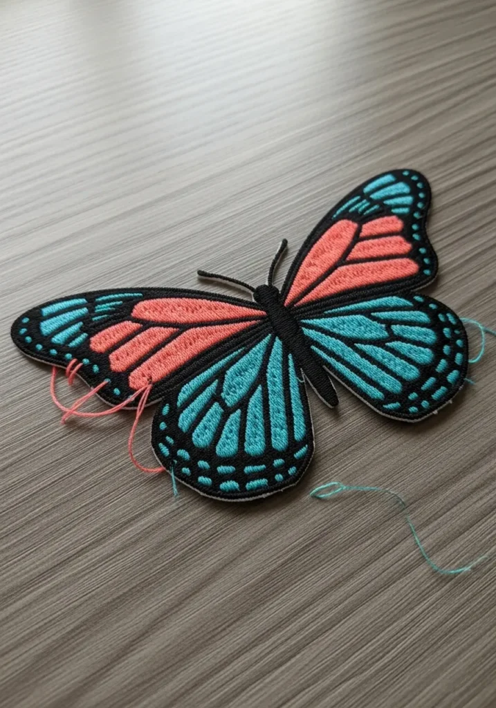 This butterfly embroidery design pops with vibrant coral and turquoise wings outlined in crisp black stitches. The wings are filled with smooth satin stitches that give them a rich, velvety look. The strong color contrast and graphic pattern make it feel modern and playful at the same time.