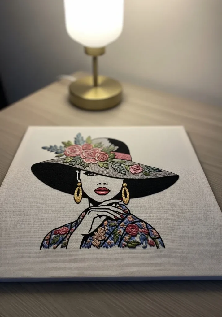 This modern embroidery piece features a stylish woman wearing a wide brim hat adorned with floral accents. The clean line stitching defines her face, while soft colorful threads bring the hat and details to life. The mix of line art and filled stitches gives it a contemporary fashion illustration vibe.