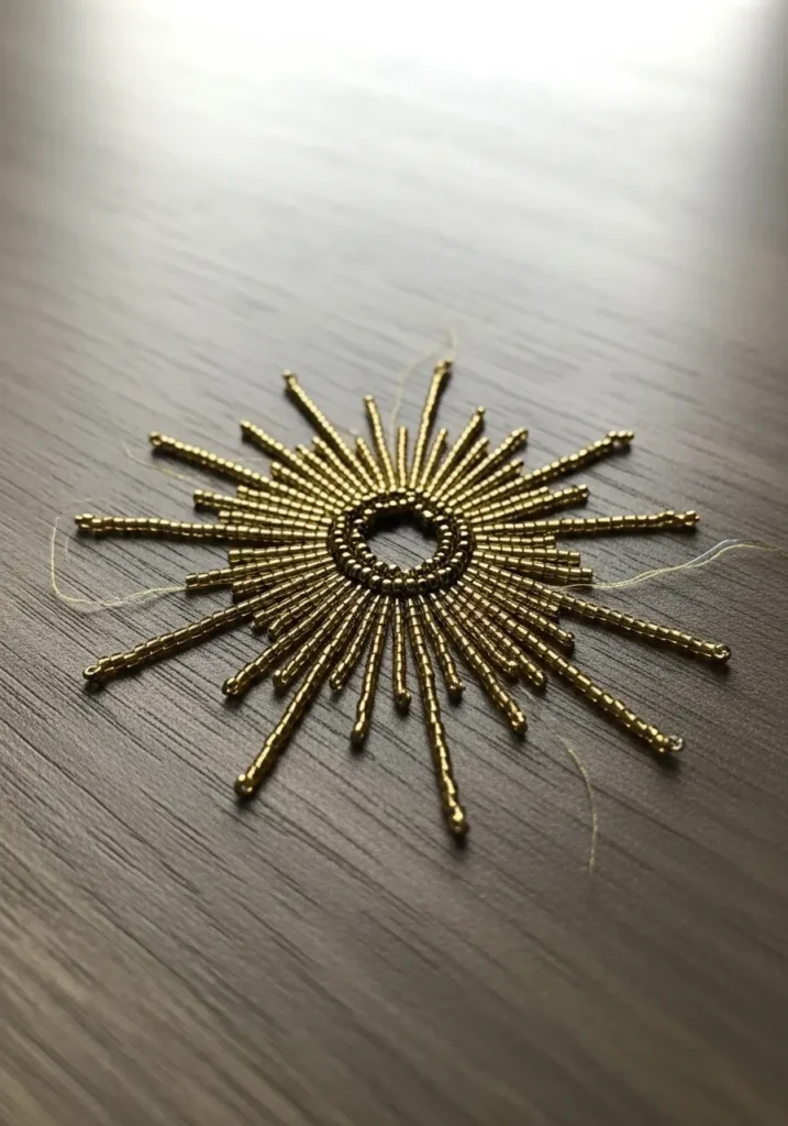 This bead embroidery design features a striking sunburst made from slim metallic gold bugle beads arranged in neat rays around a circular center. The middle is formed with tightly stitched round beads, creating a bold focal point that anchors the long, evenly spaced lines extending outward. The glossy gold finish catches the light beautifully, giving the piece a subtle shimmer while still keeping the overall look clean and structured. The symmetry and spacing make it feel modern and intentional, with just a few visible threads adding that authentic handmade touch.