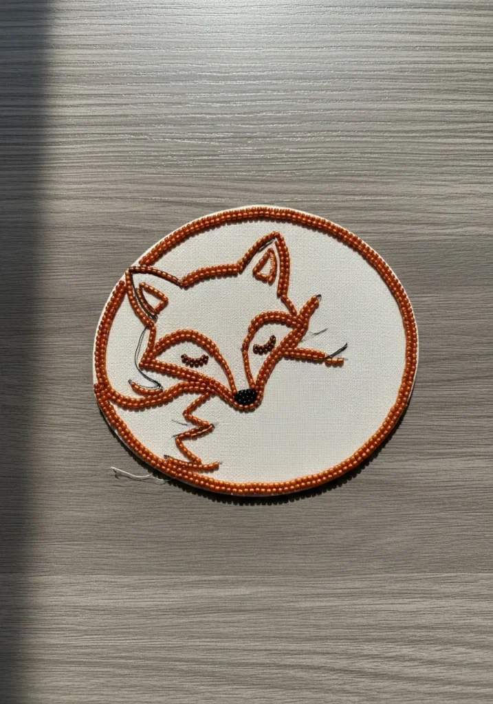 This bead embroidery design features a sweet sleeping fox stitched in warm copper orange beads on soft neutral fabric. The fox is outlined with smooth rows of tiny beads that create a clean circular shape, while simple stitched lines define the closed eyes and gentle facial details. A small cluster of black beads forms the nose, adding a subtle focal point. The design is framed within a neat beaded border that keeps everything looking balanced and modern, with slight thread details giving it that handmade charm.