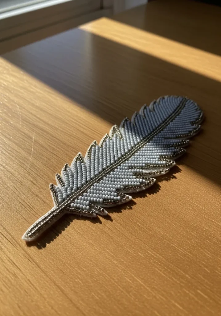 This bead embroidery design features a beautifully detailed feather stitched with tiny seed beads in a soft ombre blend from pale gray to deep navy blue. The beads are arranged in neat rows that follow the natural curve of the feather, creating a gentle sense of movement and texture. A slim beaded spine runs down the center, giving structure and a clean visual line. Subtle metallic accents along the edges add a hint of shine while keeping the overall look refined and modern.