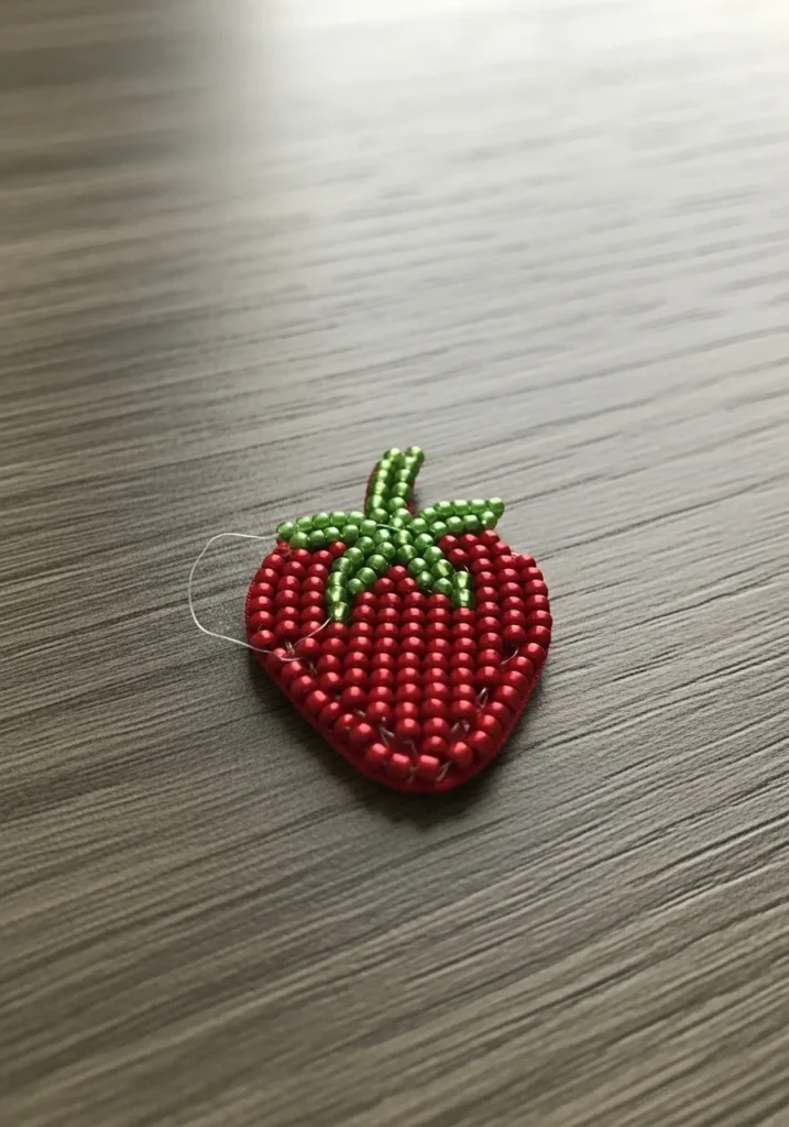 This bead embroidery design features a plump strawberry stitched with glossy red seed beads arranged in tidy vertical rows. The top is finished with bright green beads forming simple pointed leaves that give the fruit a crisp silhouette. The rounded shape feels full and smooth, while the bead texture adds a playful raised surface. A few visible thread details remind you that it is lovingly handmade, yet the overall look stays clean and modern thanks to the clear outline and limited color palette.