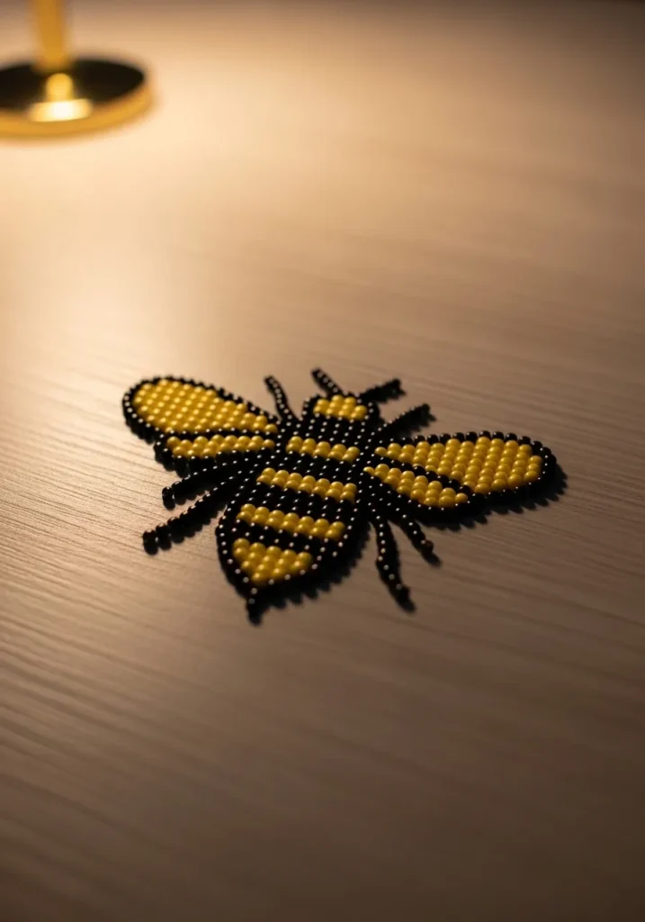 This bead embroidery design features a charming bee created with glossy yellow and matte black seed beads arranged in clean, defined sections. The wings are stitched in soft yellow beads with a smooth rounded shape, while the body shows simple horizontal stripes that give it that classic bee look. Slim black beaded lines form the legs and antennae, keeping the silhouette crisp and modern. The limited color palette and clear outline make the whole piece feel graphic and balanced, with the raised bead texture adding subtle depth.