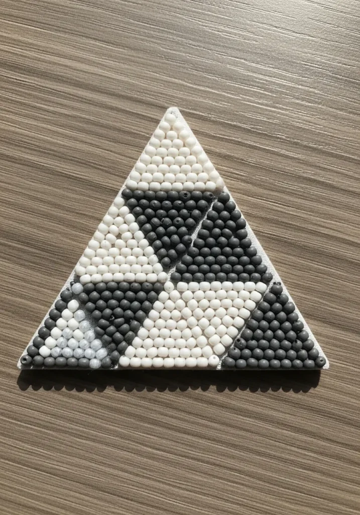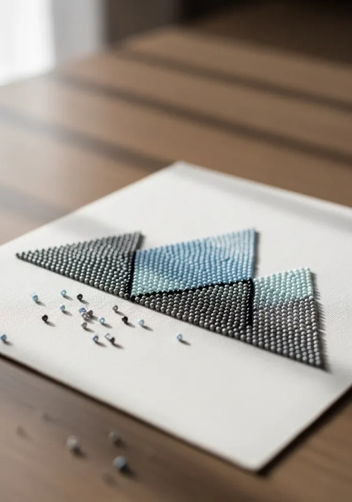 This bead embroidery design features a bold triangular layout filled with tiny round beads in shades of white, gray, and charcoal. The large triangle is divided into smaller geometric sections, each neatly packed with beads arranged in tidy rows. The contrast between light and dark areas creates a modern mosaic effect, while the clean edges keep the overall look sharp and structured. The matte bead finish adds a subtle texture that feels smooth and satisfying without overwhelming the simple design.
