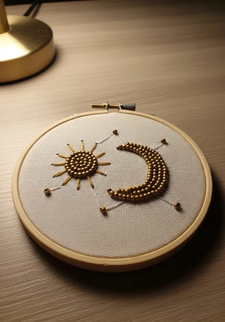 This bead embroidery design features a radiant sun and a curved crescent moon stitched in warm metallic gold beads on natural linen fabric. The sun is formed with a tight circular cluster of beads at the center, surrounded by slim bugle bead rays that create a clean starburst effect. Beside it, the crescent moon is built with smooth rows of round beads that give it a softly layered look. Tiny connecting bead accents add a subtle constellation feel, while the neutral background and wooden hoop keep everything looking simple and balanced.