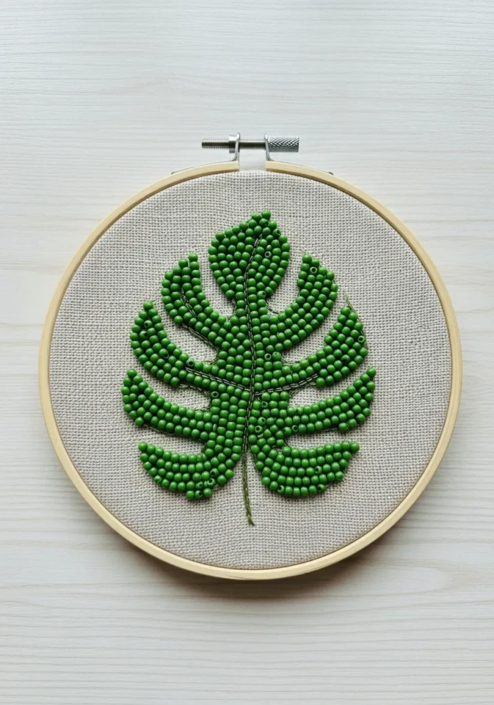 This bead embroidery design features a bold monstera leaf created with glossy green round beads stitched onto natural linen fabric. The leaf is neatly shaped with curved sections and a defined center vein, giving it that clean, modern look we all love. The bright green beads stand out beautifully against the soft beige background, and the smooth wooden hoop frames the piece in a simple, understated way. The beads add a raised texture that catches the light, while tiny thread details along the veins remind you that this is lovingly handmade.