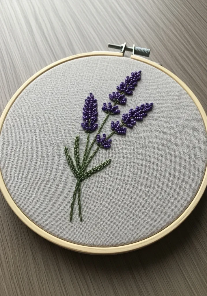 This bead embroidery design features a delicate lavender sprig stitched with tiny purple seed beads clustered into soft floral spikes. Slim green embroidery floss forms the stems and narrow leaves, creating a lovely contrast between glossy beads and matte thread. The beads are arranged in neat rows that give each bloom a slightly raised texture, while the neutral linen background keeps the whole piece looking clean and airy. Framed in a wooden hoop, the composition feels balanced and beautifully minimal.
