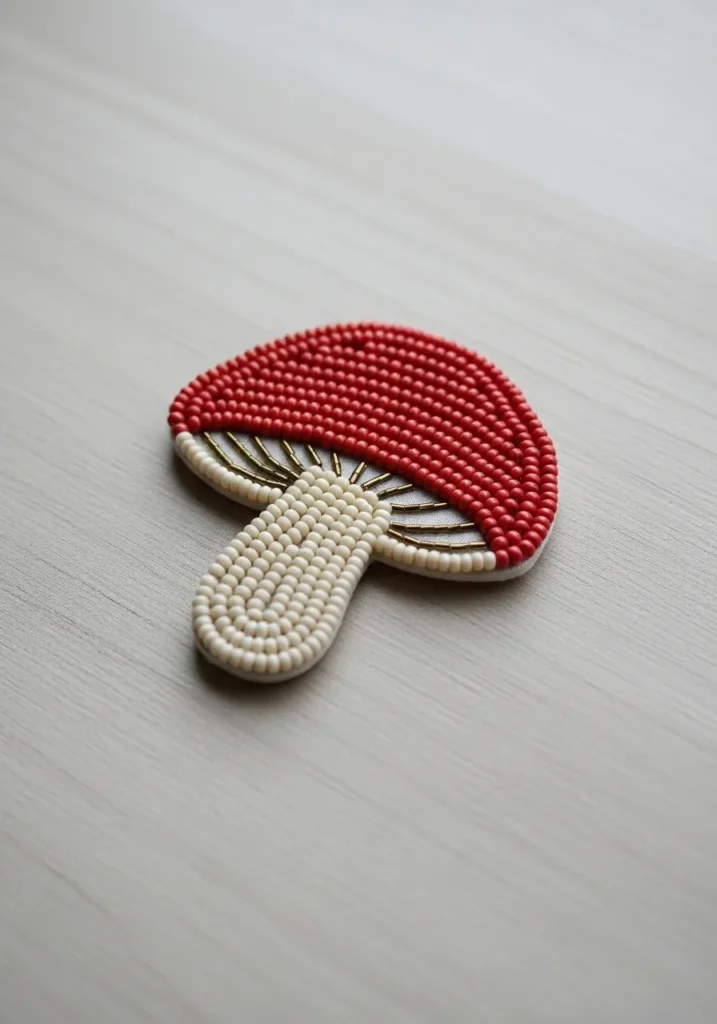 This bead embroidery design features a bold little mushroom stitched with glossy red seed beads forming a smooth rounded cap. The stem is filled with soft ivory beads arranged in neat curved rows, giving it a plump and balanced shape. Fine metallic lines beneath the cap suggest delicate gill details, adding just enough texture without making the design busy. The clean outline and simple color pairing keep the overall look modern and fresh, while the raised bead surface gives it a lovely tactile finish.