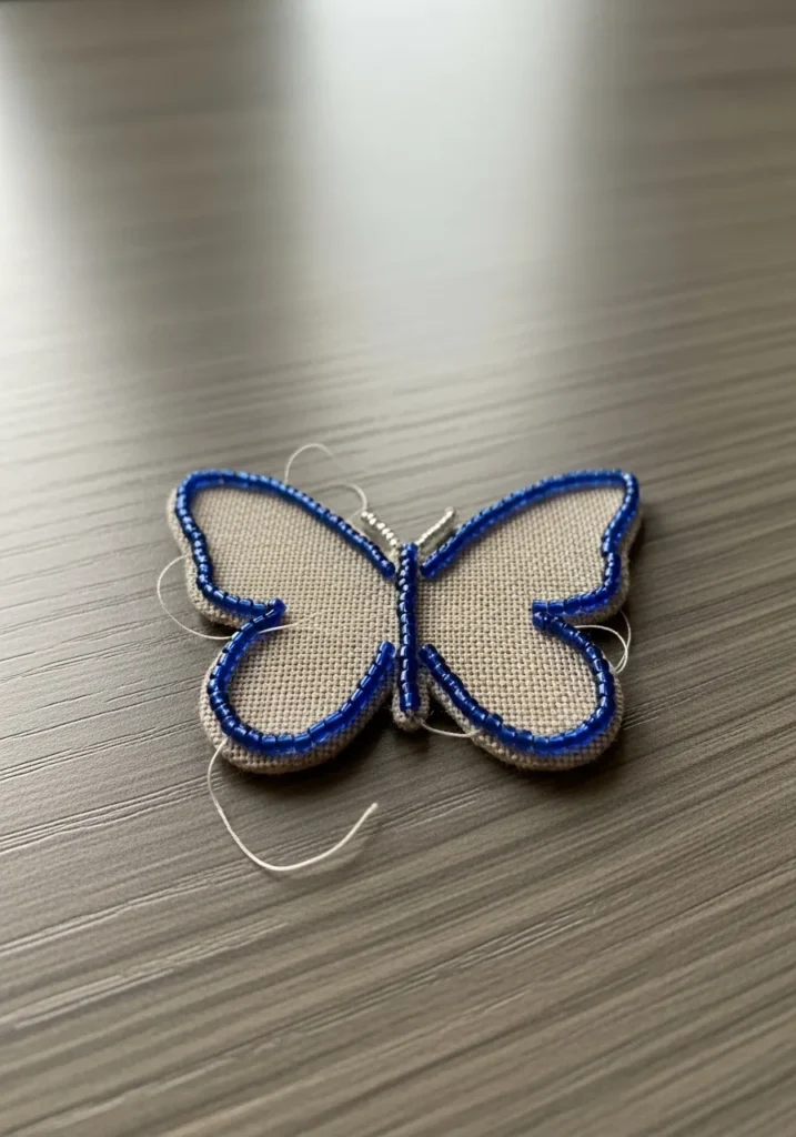 This butterfly bead embroidery features a clean linen base shaped into soft wings, outlined with vivid cobalt blue seed beads. The beads trace the curves of the wings in smooth, even lines, giving the design a crisp and modern edge. The center body is subtly stitched with slim metallic beads, adding just a hint of shine without overpowering the simplicity. The neutral fabric paired with the bold blue border creates a fresh contrast that feels both graphic and elegant.