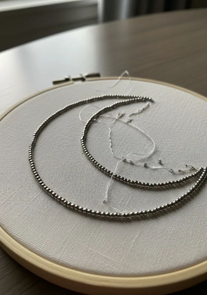 This modern bead embroidery hoop features two sleek crescent moons stitched in metallic silver seed beads on soft white fabric. The outer crescent curves gently around a smaller inner moon, creating a layered look that feels clean and balanced. The beads are aligned in smooth, continuous rows that catch the light with a subtle shimmer. A few visible thread tails and slight spacing variations add that handmade touch, while the natural wooden hoop frames the design in a simple and understated way.