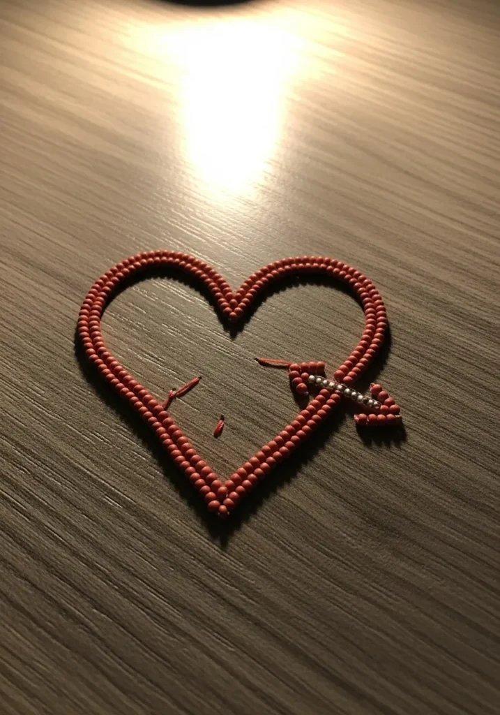 This bead embroidery design features a bold heart outline stitched with small matte red beads arranged in two clean rows for a smooth and defined shape. A simple arrow crosses through one side of the heart, created with matching red beads and a slim line of metallic silver beads at the center for subtle contrast. The overall look is crisp and graphic, with the rounded beads adding a soft raised texture against the neutral fabric. The design feels balanced and uncluttered, which gives it that fresh modern finish.