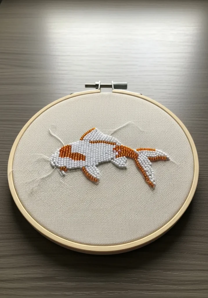 This bead embroidery design features a sleek koi fish stitched with small white and warm copper beads on natural linen fabric. The body is filled with smooth white beads, while copper beads trace the fins and flowing tail, creating a clean contrast that feels modern and balanced. The curved silhouette gives the piece gentle movement, and the raised bead texture adds subtle dimension against the soft neutral background. Framed in a simple wooden hoop, the overall look is minimal yet eye catching.