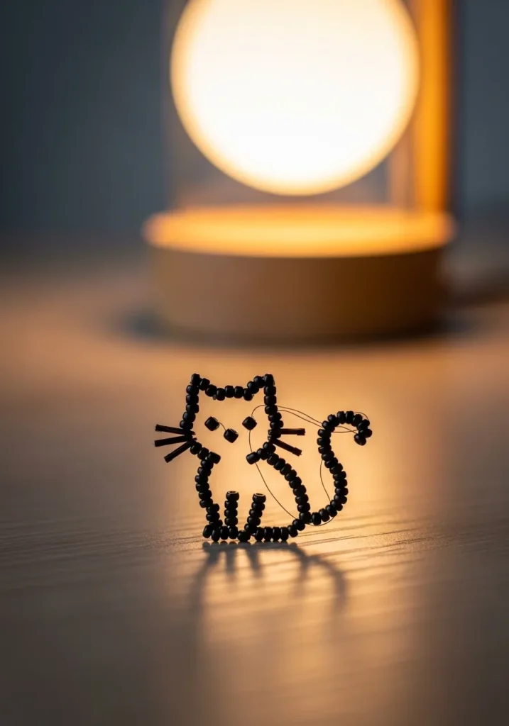 This bead embroidery design features a tiny sitting cat formed entirely from small matte black beads stitched into a clean silhouette. The rounded head, pointed ears, and curved tail are outlined with evenly spaced beads, while a few square beads create simple eyes and a nose for subtle character. Fine thread holds the structure together, giving the piece a delicate handmade look with slight variations that add charm. The overall design feels sleek and modern, with strong contrast and a clear shape that stands out beautifully against a light background.